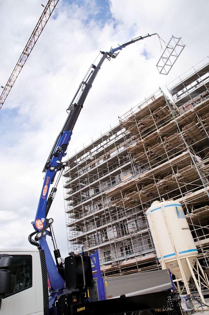 Operators can select from a wide range of configurations, including LC versions with a hydraulically retractable first boom for optimized short-range handling. With up to seven hydraulic extensions, the crane achieves a maximum outreach of 19.05 m horizontally and 22.95 m vertically. For greater reach, jib-equipped versions extend the working envelope beyond 24 m horizontally and over 28 m vertically, depending on the configuration.