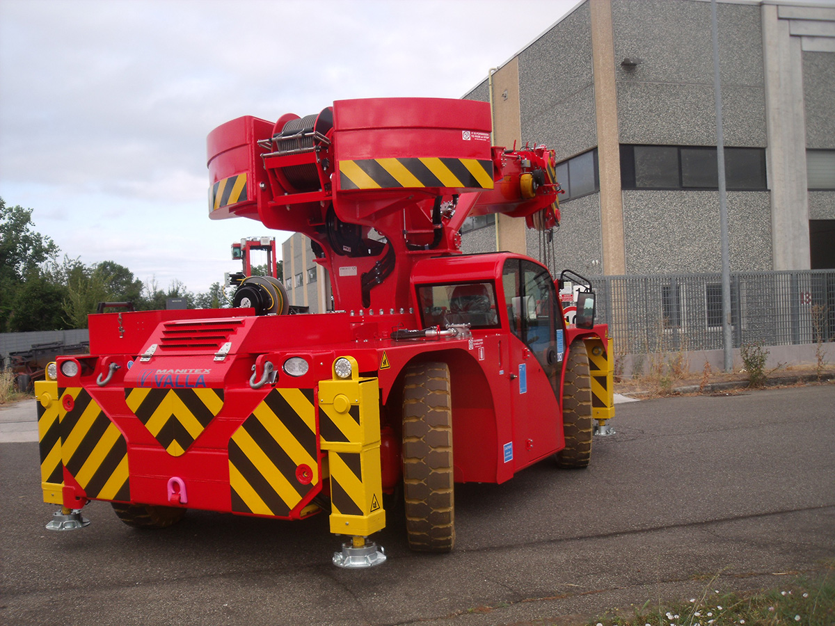 Standard features include a variable tilting head, non-marking tires, and front and rear oil-immersed disc brakes for maximized stopping power. The crane supports full customization, including ATEX transformation for operation in explosive environments and integration with the Valla Connect system for remote fleet monitoring and diagnostics.