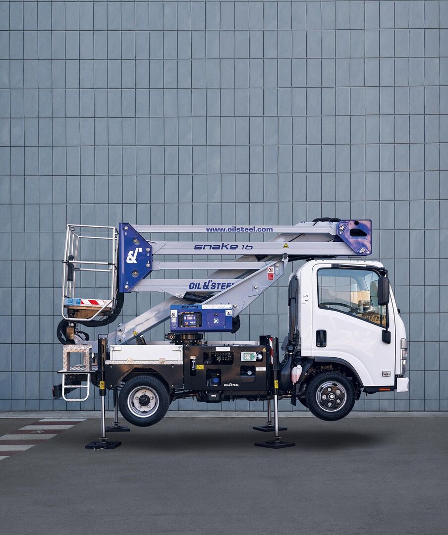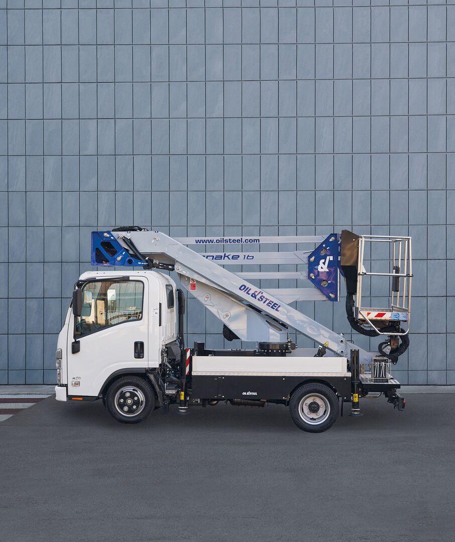 The Snake 16 is a compact articulated aerial platform, offering simple access and precise maneuverability for urban and industrial applications, mounted on the agile Isuzu M21 chassis.