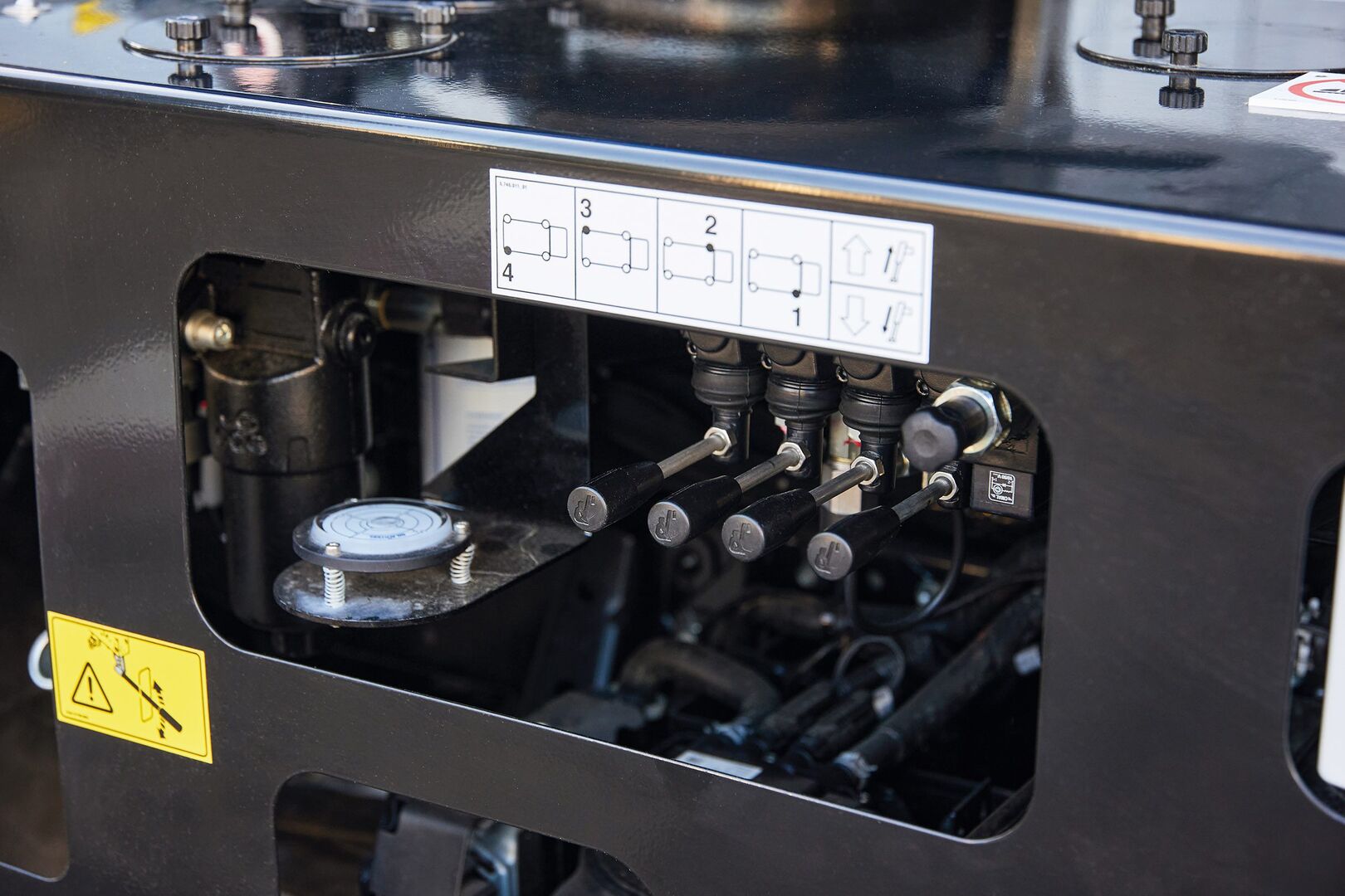 Standard features include an electro-hydraulic PTO with automatic release, warning systems for PTO and outrigger deployment, protective casings on control boxes, thermal protections, and non-slip flooring.