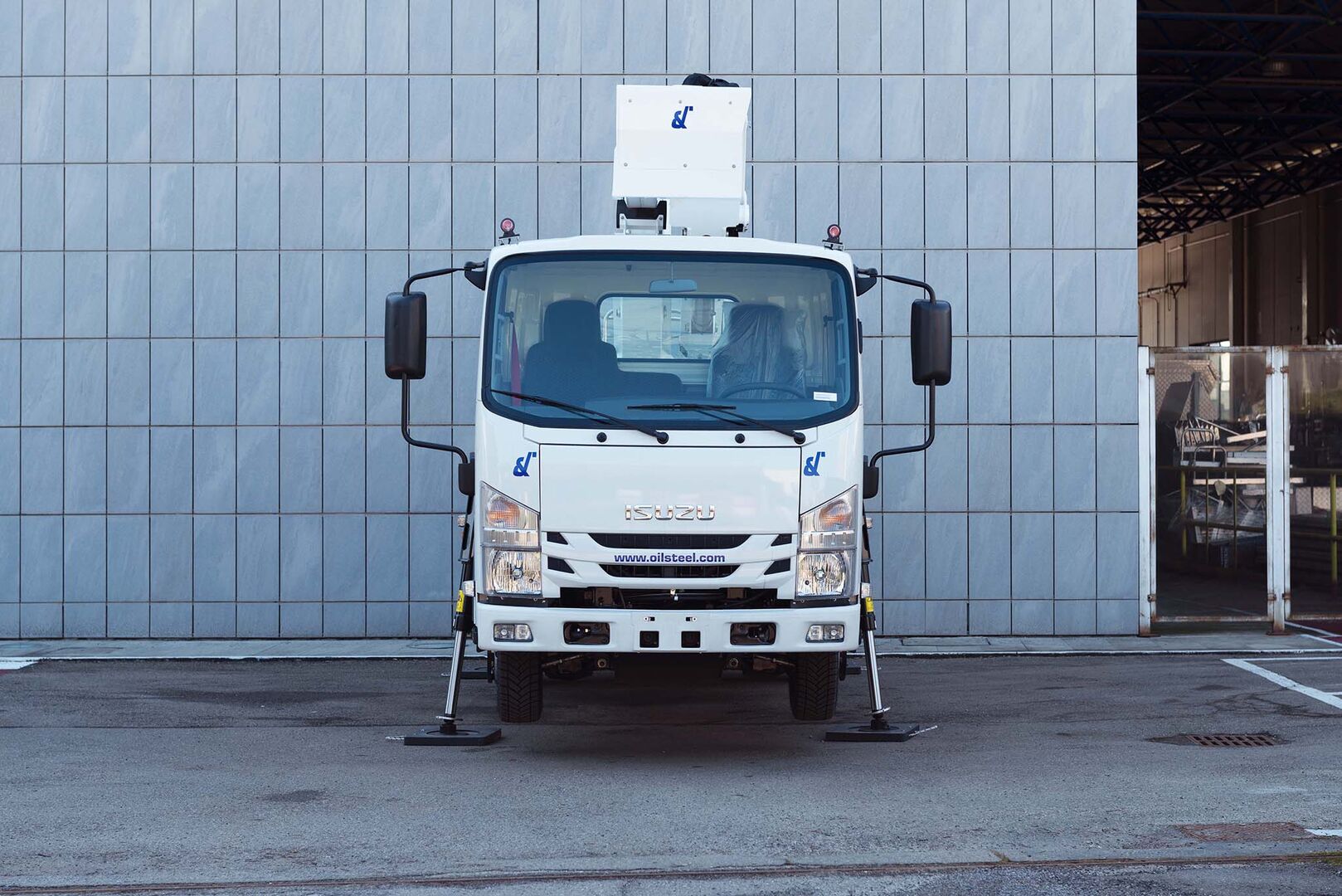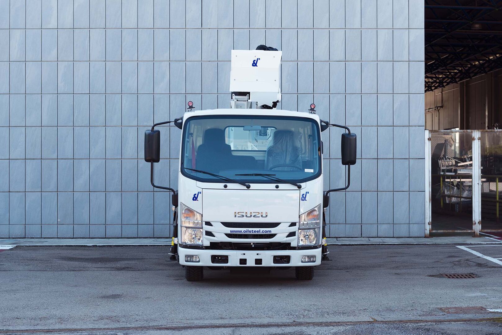 Mounted on the Isuzu M21 Ground Blue H chassis, the truck features power windows, a tilt-adjustable steering wheel, LED lighting, automatic headlight activation, central locking, and essential safety aids such as a reverse warning beeper and a seat belt buzzer. Optional equipment enhances the unit’s versatility, including fiberglass insulated baskets, debris protection kits, tilt sensors, auxiliary electric pumps, height limitation systems, toolboxes, reflective decals, air-water lines to the basket, custom paintwork, remote connectivity kits, and all-season tires.