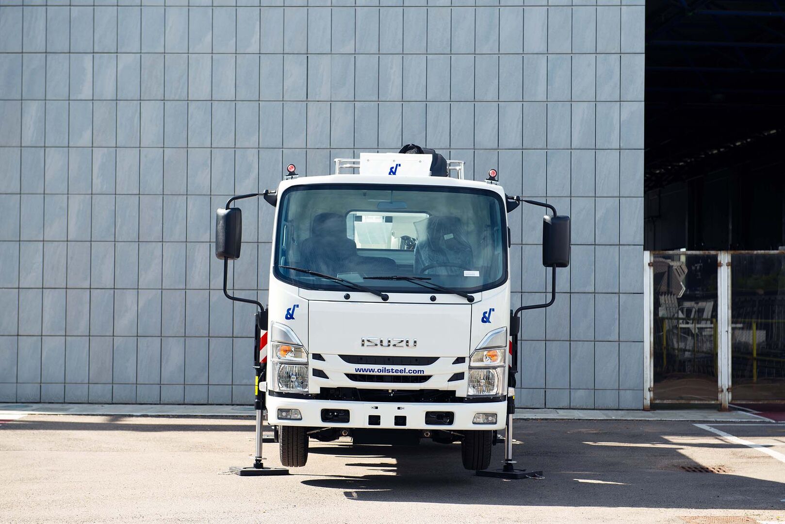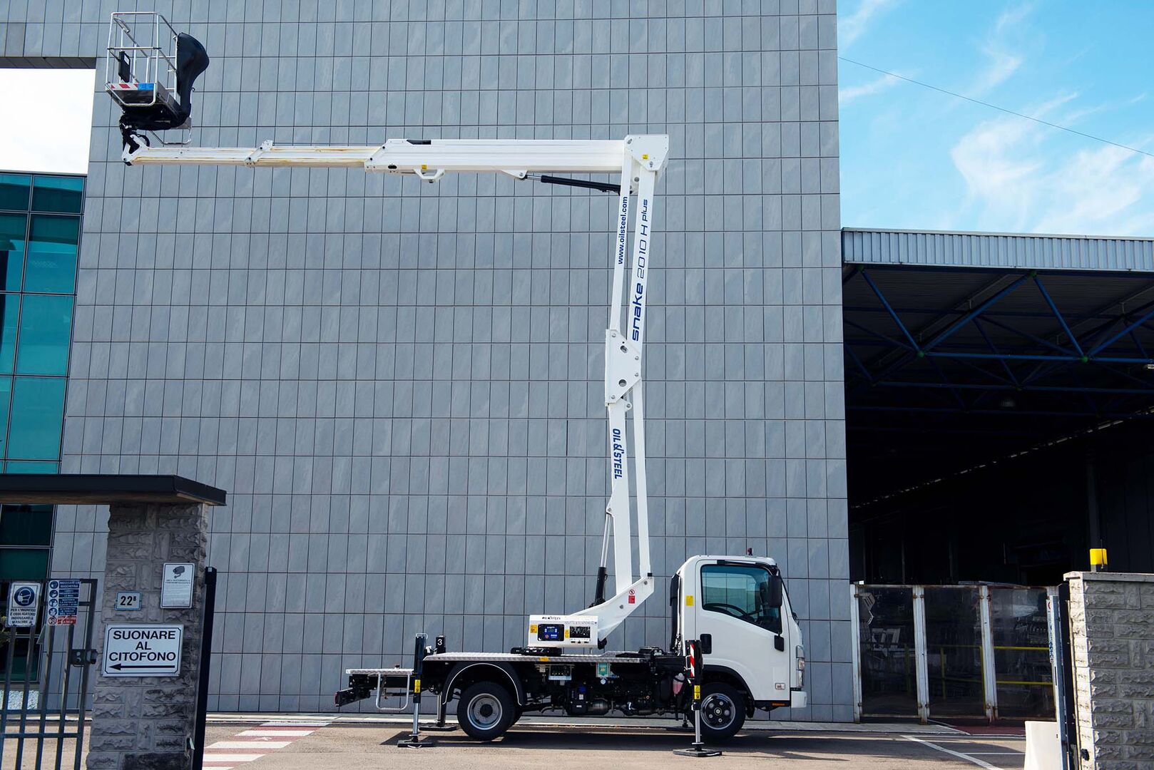 Mounted on the Isuzu M21 Ground Blue H (123 HP, Euro 6d), the Oil&Steel Snake 2010 H Plus delivers a 20 m maximum working height, a 10.2 m outreach, and a 250 kg basket capacity for two operators plus tools.