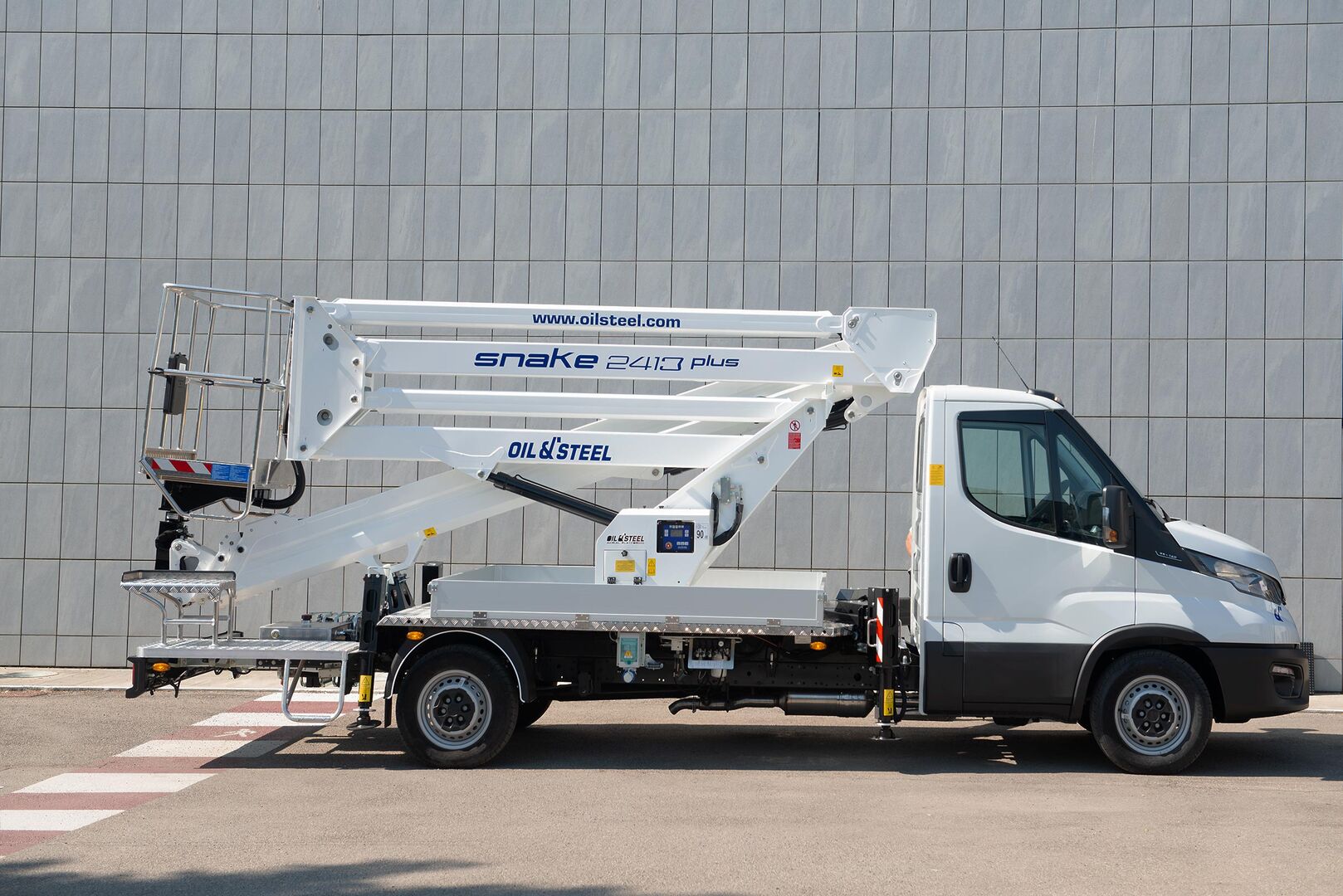 Mounted on the Iveco Daily 35S14H (Euro VI, 136 HP, wheelbase 4100 mm), the Oil&Steel Snake 2413 Plus provides a 23.5 m working height, 12.6 m outreach, and a 250 kg basket capacity.