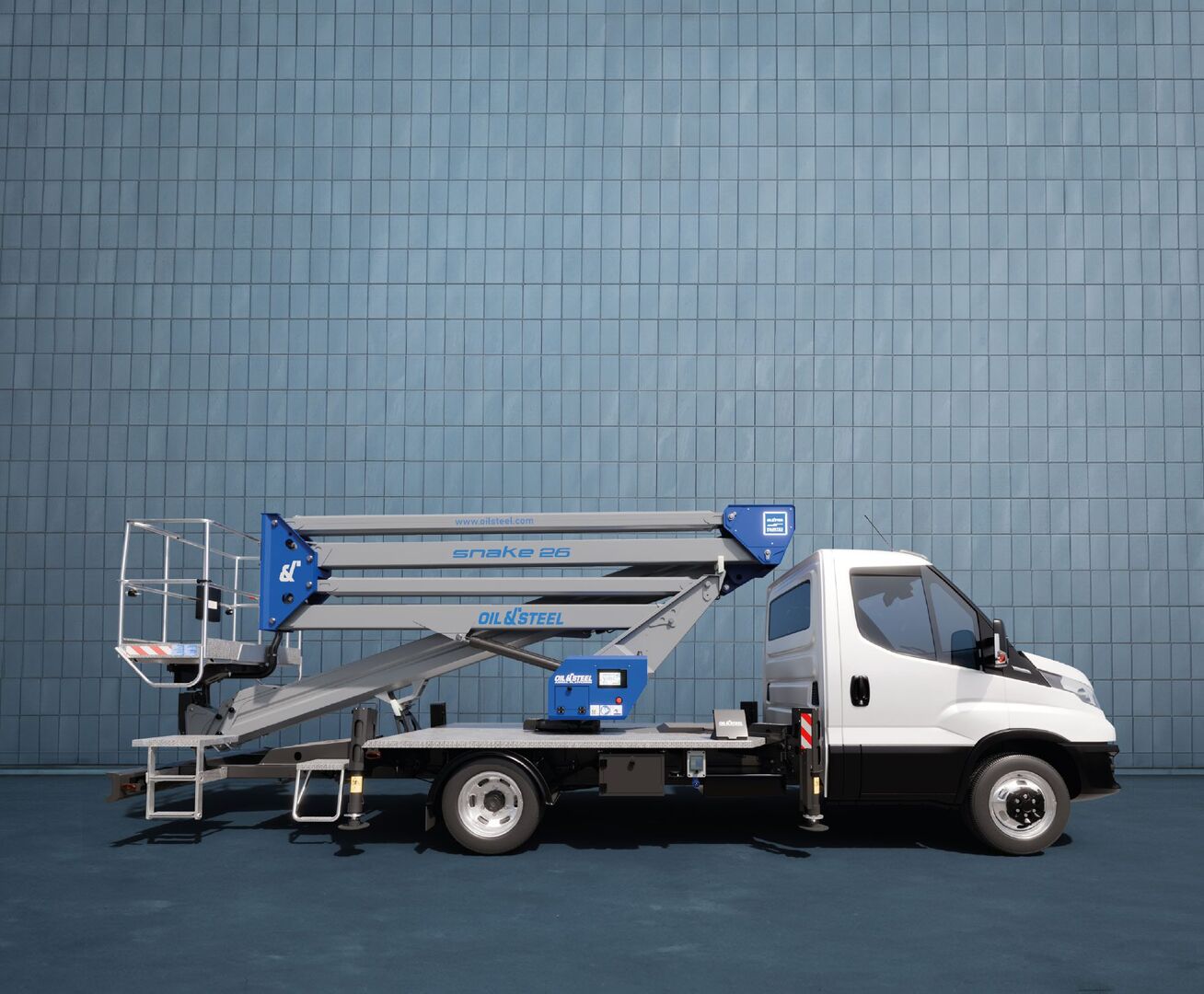 Mounted on the Iveco Daily 35S14H (Euro VIe, 136 HP), the Oil&Steel Snake 26 delivers a 25.6-meter maximum working height, a 12.2-meter outreach, and a 250 kg basket capacity—ideal for professional applications such as utilities, construction, building maintenance, and rental fleets.